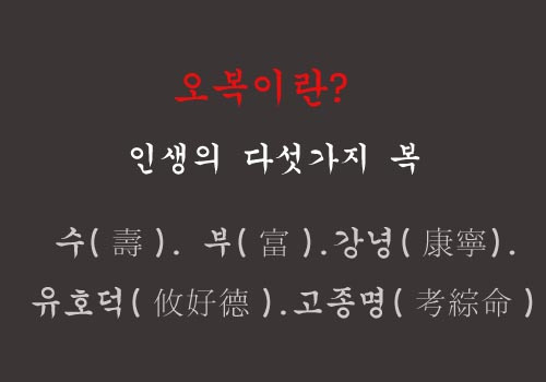 7. ‘오복’(五福) → ①‘수’(壽, 오래 사는 것) ②‘부(富)’ ③강녕(康寧·몸과 마음의 평안) ④유호덕(攸好德·덕을 좋아하고 실천함) ⑤고종명(考終命·편안한 죽음). 서경(書經)에 나옴. ④, ⑤대신 ‘귀’(貴, 명예), ‘자손 중다(衆多, 번창)를 꼽기도 한다.(문화 외)▼