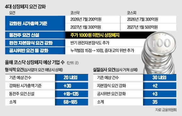 5. 주식시장 상장폐지 강화 → 7월부터 코스닥에서 주가 1000원 미만인 ‘동전주’ 상장폐지. 금융위원회, 한국거래소, ‘상장폐지 개혁방안’ 발표. 시총기준 상장 폐지 기준도 코스닥은 200억, 코스피는 300억 이하에서 각 300억, 500억 이하로 상향.(한경)▼