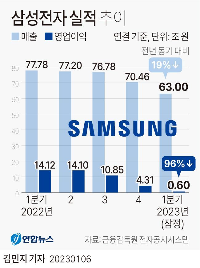 □ 삼성전자 1분기 영업이익 96% 감소…14년만에 1조원대 이하