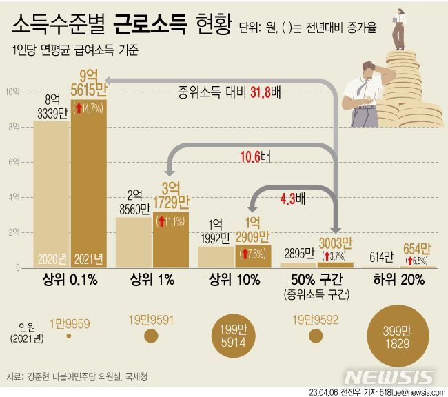 □ 상위 0.1% 직장인, 중위소득에 32배 더 번다…격차 보니