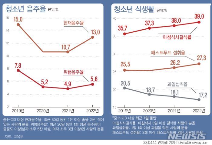 □ 청소년 음주율 증가...아침 결식률은 39%