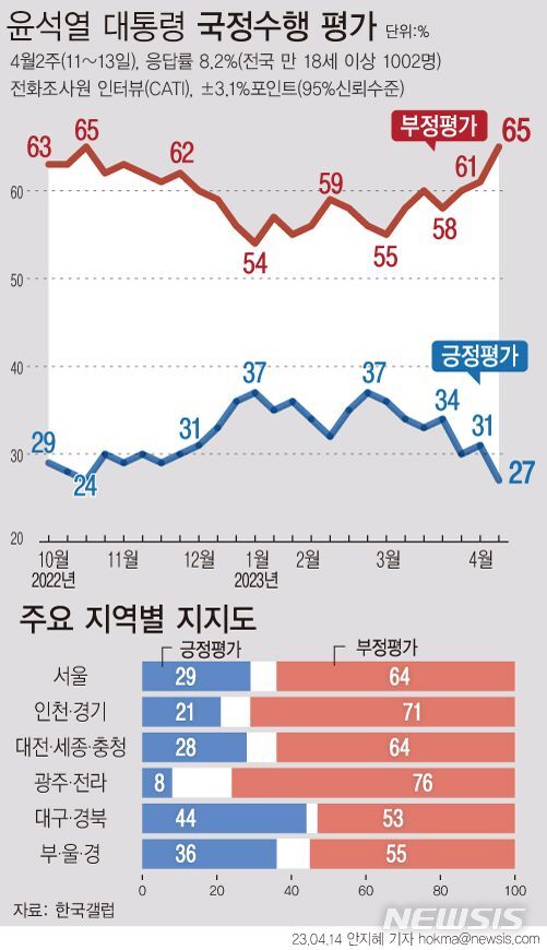 □ 윤석열 대통령 지지율 4%p 하락, 4개월만에 20%대(갤럽)