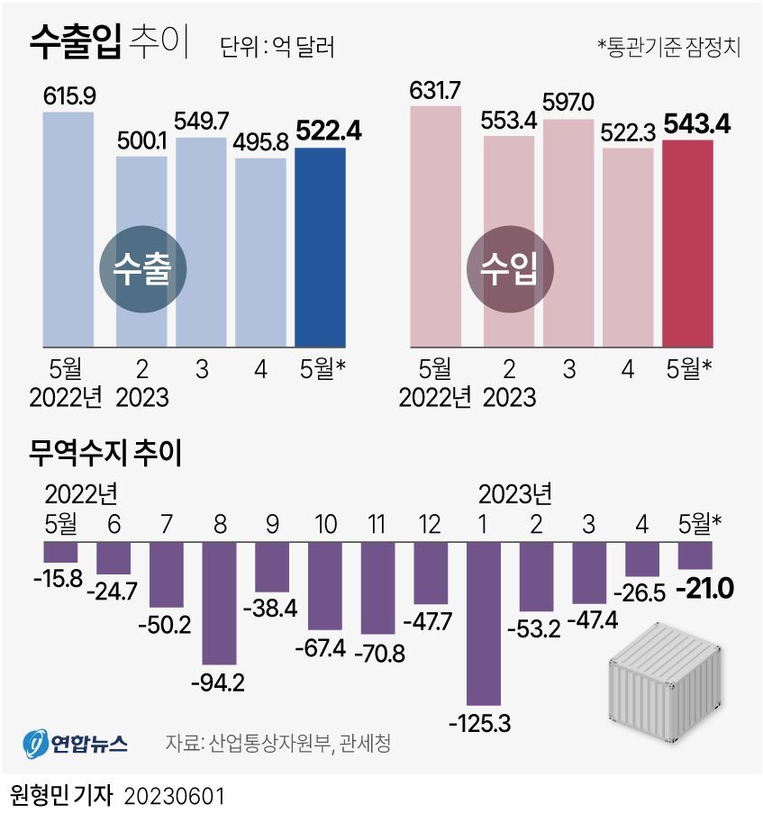 □ 5월 무역수지 -21억달러…15개월 연속 적자