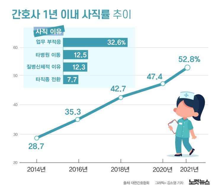 □ 탈(脫) 간호인력…간호사 1년 이내 사직률 52.8%