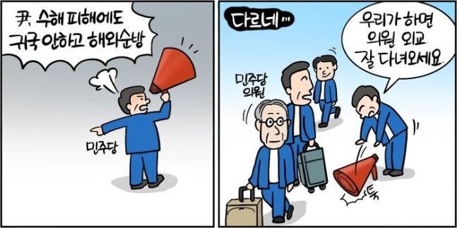 □ 데일리안 [D-시사만평] '수해 정국' 민주당 의원들 해외 나들이…윤석열 순방 비난 '철면피'!