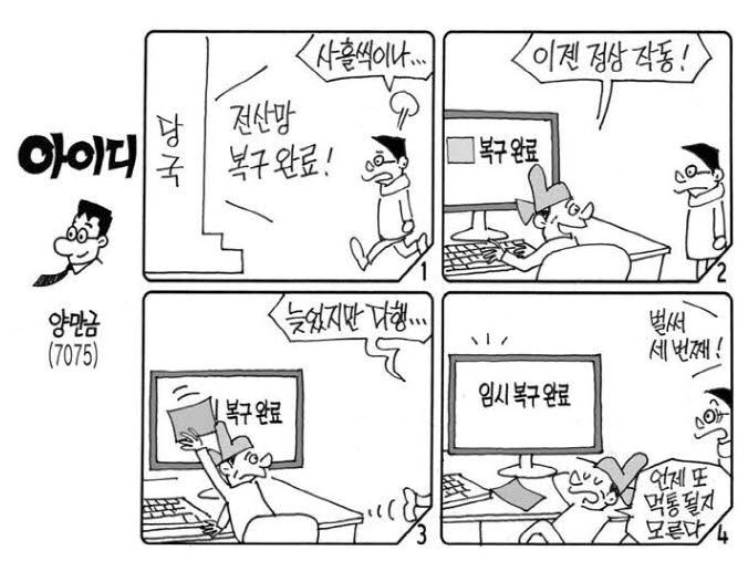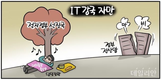 □ 데일리안 [D-시사만평] IT강국 '디지털 정부' 해외 홍보 중에 터진 '행정망 마비'…'아이구 맙소사'
