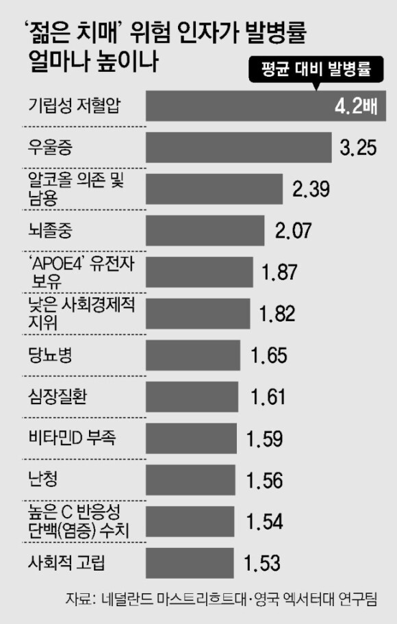 7. ‘젊은 치매’ 유발, 유전보다 술이나 우울증이 더 위험 → 네덜란드-英연구팀, 35만명 추적, 젊은 치매 부르는 12개 인자 발표. ▷기립성 저혈압, ▷우울증, ▷알콜, ▷뇌졸중, ▷유전, ▷낮은 소득, ▷당뇨, ▷심장질환, ▷비타민D부족, ▷난청, ▷염증, ▷사회적 고립 순.(동아)▼