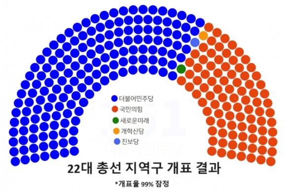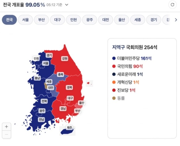 1. 22대 총선 결과 지도(4월 11일 5시, 99.05% 개표기준) ▼