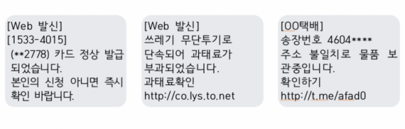2. 이런 건 보이스 피싱 문자 → ▷‘카드 정상 발급되었습니다. 본인 아니면 즉시 신고 바랍니다’... ▷‘쓰레게 무단 투기로 단속되었습니다. 과태료 확인’... ▷송장번호 4604**** 주소 불일치로 물품 보관 중입니다. 확인히기‘...(아시아경제)▼