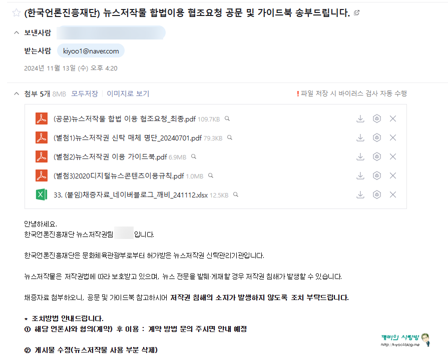 그런데, 지난 달 [한국언론진흥공단]으로부터 "뉴스 저작물 합법이용 협조요청 공문 및 가이드북 송부드립니다"라는 제목의 저작권 침해와 관련된 메일을 받았습니다.