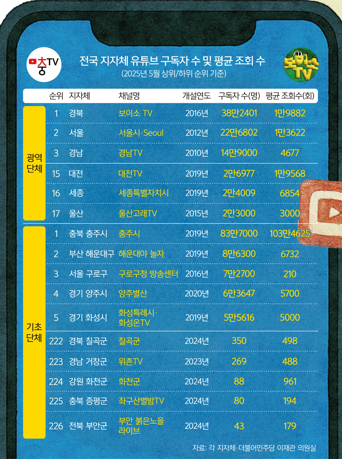 적게는 몇 천만원 많게는 10억 가까이 세금 투입되지만 구독자 수 등 역할 미미. 기초 단체의 경우 ‘충주맨’으로 유명한 충주시의 경우 구독자 83만, 평균 조회수 100만 넘는 곳도 있지만 구독자가 단 43명인 곳도 있어.(세계)▼