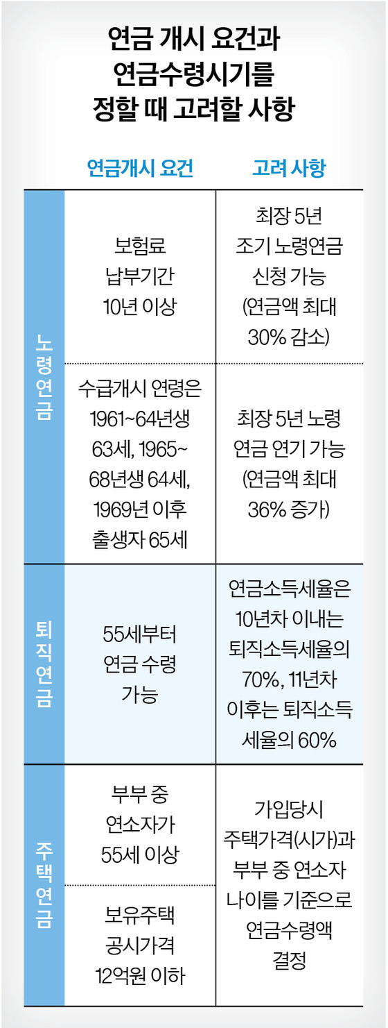 자기가 받을 나이(69년생 이후 65세)보다 5년 빨리 또는 늦게 받을 수 있다. 1년 앞당기면 연 6%씩 줄고 1년 늦게 받으면 7.2%씩 늘어난다. ‘일찍 죽으면 어떡하지’ 하는 걱정에 연금을 당겨 받으려고 한다면, 반대로 ‘오래 살면 뭘로 살까’ 하는 고민도 함께해야 한다.(중앙선데이)▼