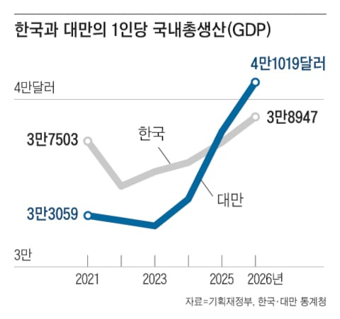 대만의 올 1인당 예상 GDP는 3만 8066달러로 우리나라(3만 7430달러)를 넘어서는 것은 물론 내년 사상 처음 ‘4만달러 클럽’(4만 1019달러)에 가입할 것으로 전망. 2021년 3만달러를 넘어선 지 불과 5년 만. 2017년 3만 달러 달성 이후 제자리인 한국과 대조.(헤럴드경제)▼