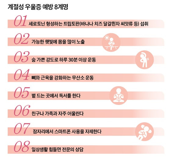 8. 볕 드는 시간은 짧아진 계절, 계절성 우울증 예방 8계명(▼) → ①세로토닌 형성에 도움되는 바나나, 치즈, 달걀흰자, 씨앗류 섭취 ②가능한 한 햇빛에 많이 노출 ③숨가쁠 정도로 30분 이상 운동 ④뼈와 근육을 강화하는 무산소 운동 ⑤친구나 가족과 어울리기.(중앙선데이)