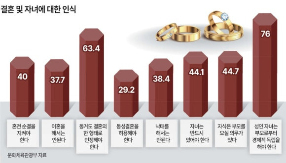 2. ‘자녀가 반드시 있어야 한다’... 절반도 안 돼 → 44.1%... 문화체육관광부 ‘2025년 한국인의 의식·가치관 조사’. 2022년 조사의 61.7%보다 3년새 17.6%포인트나 하락... .(헤럴드경제)▼