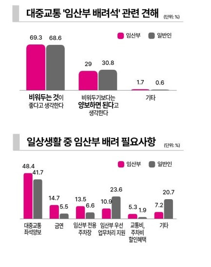 6. 일반 국민 82.2%, 임산부 배려한 적 있다 → 반면 임산부의 56%만 배려 받은 적 있다고 응답. 인구보건복지협회 조사. 인식 차가 26.5%포인트로 큰 셈. 임산부 배려 점수는 69.1점으로 전년 대비 6.2점 상승했지만 임산부가 매긴 점수는 64.9점으로 되레 2점 하락.(중앙)▼