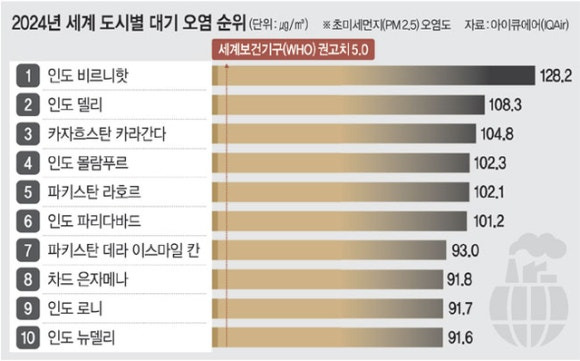 8. 중국보다 더하다... 세계 최대 공기 오염지역은 인도-파키스탄 → 스위스 대기질 분석업체 아이큐에어(IQAir)가 최근 발표한 ‘2024년 세계 대기 오염 도시 보고서’, 상위 10개 도시 중 8곳이 인도(6곳), 파키스탄(2곳, 20위권에 6곳)... 카자흐스탄, 아프리카 차드 각 1곳.(문화)▼
