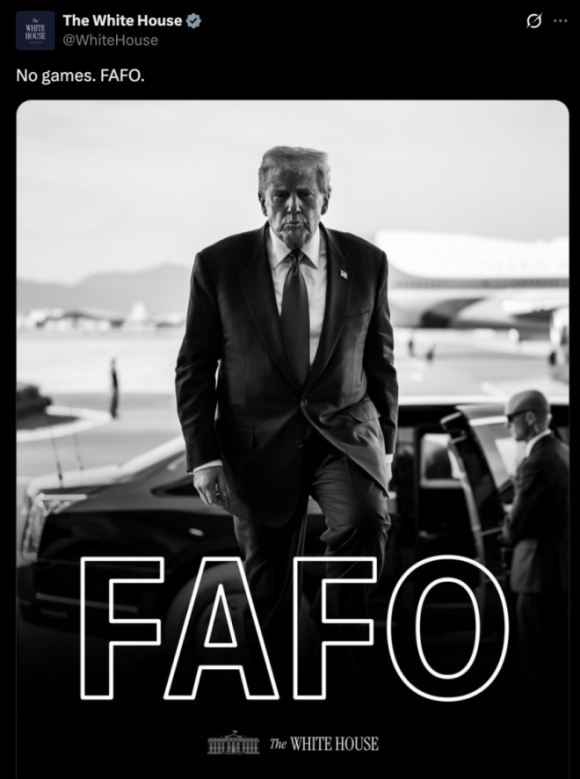 2. ‘까불면 다친다’... 트럼프의 엄포용 SNS 사진은 한국에서 촬영한 것? → 그가 결연한 표정으로 계단을 오르는 흑백 사진 위에 ‘까불면 다친다’라는 의미의 미국 속어(FAFO)가 씌어 있다. 이 사진은 지난해 10월 시진핑과 회담 장소인 김해공항에서 찍힌 것이어서 여러 가지 해석을 낳고 있다...(서울)▼