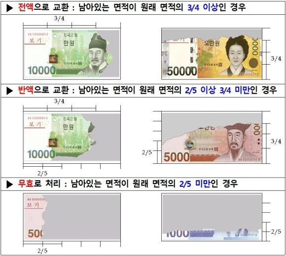 4. 손상된 지폐 교환 기준 → 3/4 남아 있으면 전액, 2/5이상(~3/4)이면 절반, 2/5 미만이면 무효(보상 금액 없음). 경미하게 손상된 화폐는 일반 은행(시중은행, 농협, 수협, 우체국)에서도 교환 가능. 불에 타건 손상 심하면 한국은행.(동아)▼