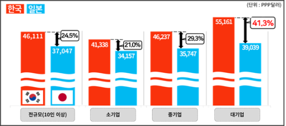 8. 한국 대기업 대졸 초봉, 일본보다 41.3%·대만보다 37% 높아 → 한국의 고용노동부, 일본 후생노동성, 대만 노동부 통계를 근거로 경총이 '구매력평가(PPP) 환율' 기준으로 분석한 결과. 10인 이상 사업장으로 범위를 넓혀도 한국이 일본보다 24.5% 높아.(한국)▼