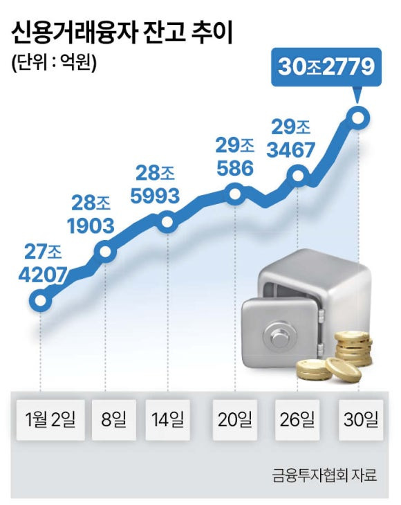 2. 주식 창만 바라보며 잠 못 이루는 ‘주식 공화국’ → 전국민 주식 광풍. 일에 집중이 안된다. 맛집 탐방, 수다는 옛말, 모든 대화 주제는 ‘기승전 주식’... 투자 과열 경고하는 수치도 곳곳에서 나와. 빚투 지표인 신용거래융자 잔고, 한달 새 3조 증가.(헤럴드경제)▼