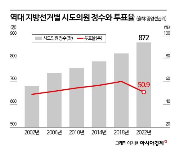 9. 인구는 감소하는데 늘어나는 시/도 의원 → 2002년 682명이었던 시도 의원수는 2006년에는 733명, 2014년 789명, 2022년에는 872명까지 늘었다. 최근 여야는 또다시 시·도의원 늘리기를 위한 법 개정 움직임.(문화)▼