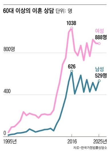 8. 60대 넘어 이혼 상담 급증 → 전체 상담받은 사람 중 60대 이상 비율은 남성의 경우는 거의 절반(49.1%), 여성의 경우 1/5이 60대 이상... 한국가정법률상담소, 2025년도 상담 통계.(국민 외)▼