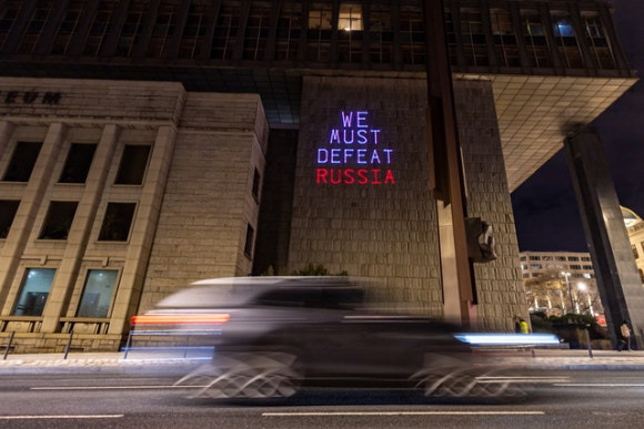 "무찌르자 러시아", 체코 프라하 국립박물관 외벽에 시위대가 연출한 '러시아를 무지르자' 문자. 옛 소련의 지배를 받았던 동유럽은 러시아에 대해 더 부정적이다.