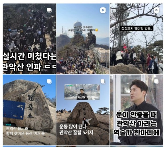 5. 관악산에 갑자기 웬 등산 인파? → 퀴즈 출연한 역술가의 ’운이 안 풀릴 때는 관악산 연주대 가라‘ 이 한마디에 관악산 정상석 사진 대기 줄 80m... 네이버 검색 지수도 18~24에서 일주일 만에 최고점인 100 기록. 미신이 하나의 콘텐츠가 되어가고 있다는 평.(동아)▼