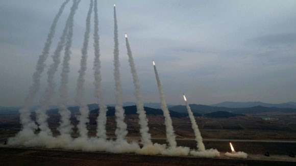 북 노동신문에 보도된 600㎜ 초정밀다연장방사포 발사훈련 장면
