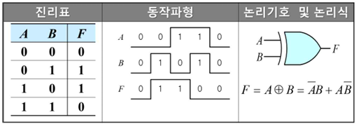 | XOR | F = A⊕B | 홀수 개의 1이 입력될 때 | 배타적 OR |