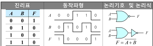| NOR | F = A̅+̅B̅ | 모든 입력이 0일 때만 | NOT OR |