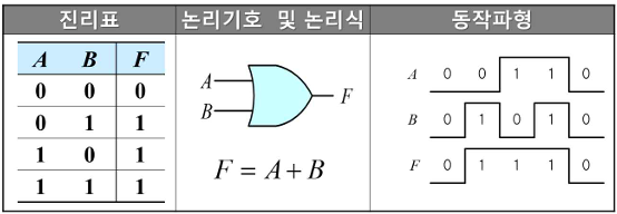 | OR | F = A+B | 하나라도 1이면 | 기본 |