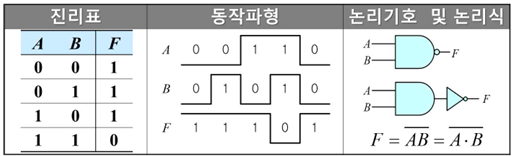| NAND | F = A̅B̅ | 모든 입력이 1이 아닌 경우 | NOT AND |