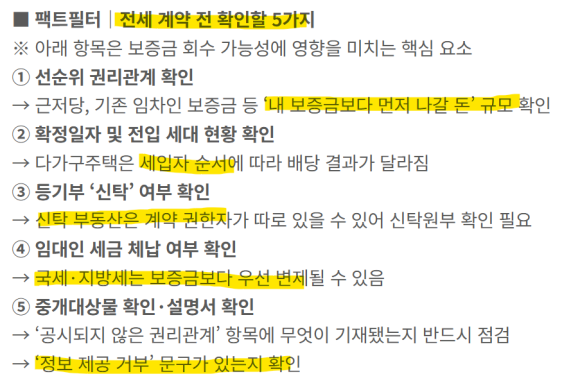 3. 전세 계약 전 반드시 확인할 5가지 → ①근저당 등 선순위 권리자 ②다가구 등은 전입자 현황 및 확정일자 ③등기부에 ‘신탁’ 여부 ④임대인 세금체납 ⑤임대인 정보제공을 거부 여부 등.(동아)▼