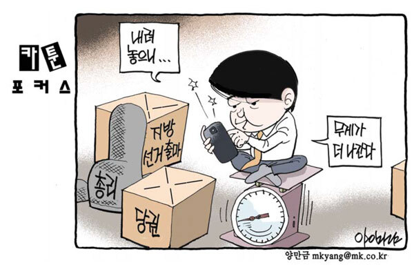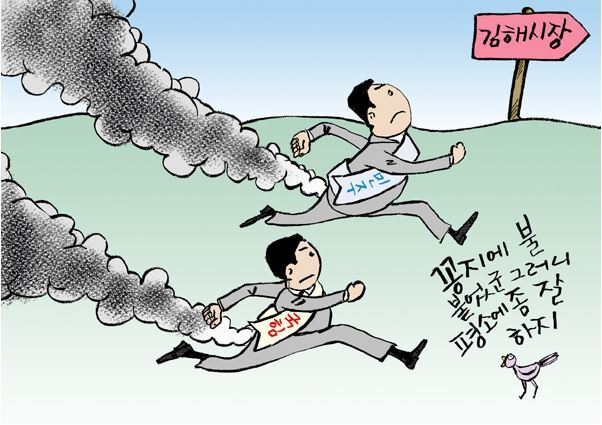 □ 영남매일 [만평] 김해시장…꽁지에 불 붙었군…