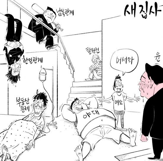 □ 데일리안 [D-시사만평] 윤석열 대통령이 먼저 해야 할 일…찢어진 국민 꿰매기