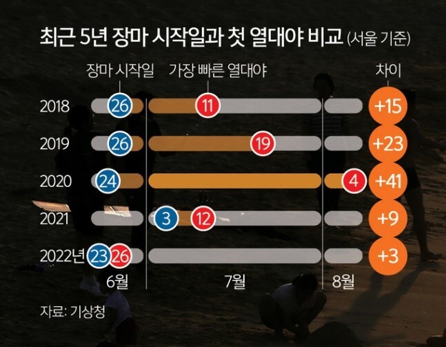 7. 사상 첫 6월 열대야, 왜? → 올해 지속적으로 불어 드는 남서풍이 주요인. 최근 5년간 첫 열대야 일자. ▷2018년 7.11일 ▷2019년 7.19일 ▷2020년 8.4일 ▷2021년 7.12일 ▷2022년 6.26일.(세계)▼