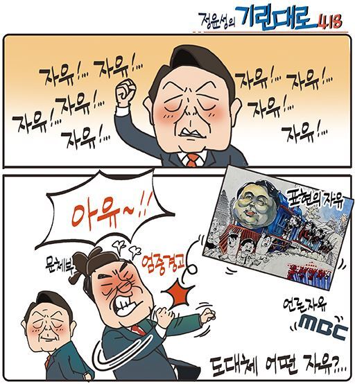 □ 전북일보 [정윤성의 기린대로418] '윤석열차' 금상 풍자그림에 문체부 '엄중경고'…도대체 어떤 자유?…
