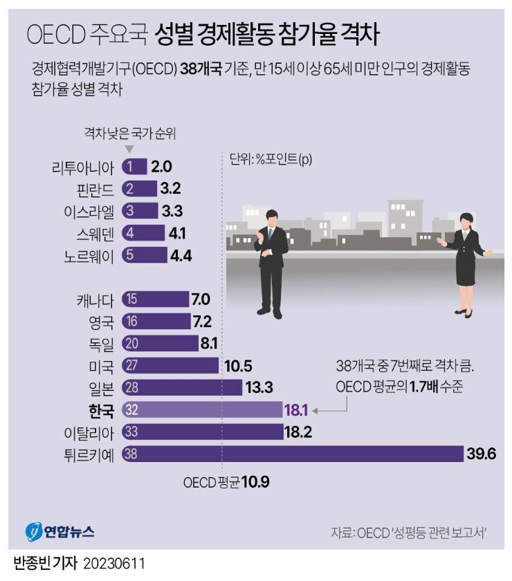 □ OECD 주요국 성별 경제활동 참가율 격차