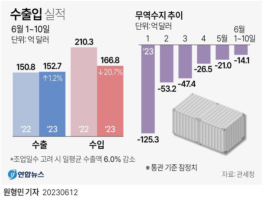 □ 6월 1~10일 수출 1.2% 중가...무역적자 14.1억달러