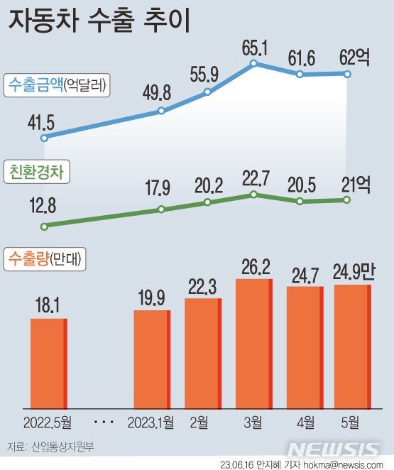 □ 지난달 자동차 수출 62억달러...친환경차 수출 64% ↑