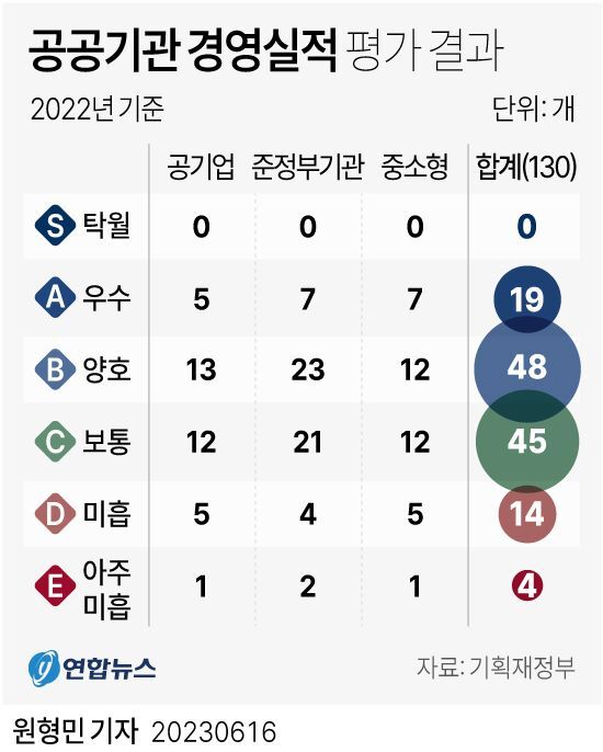□ 공공기관 경영실적 기관별 평가 결과...130곳 중 18곳 미흡 이하