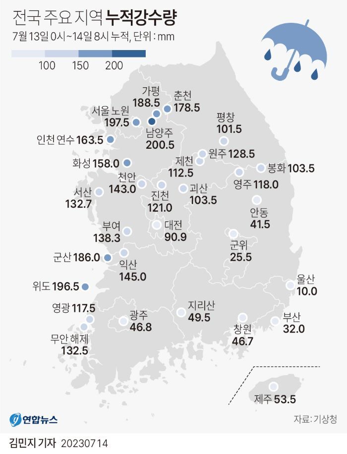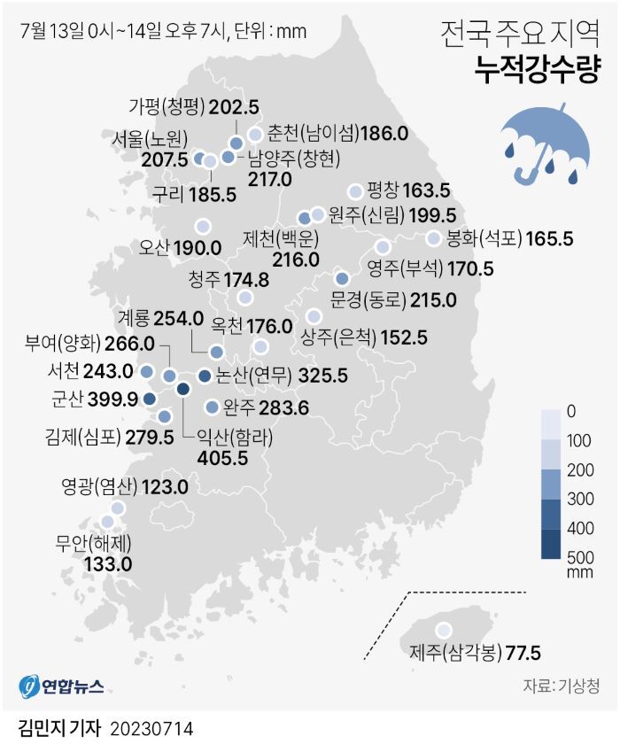 □ 전국 주요 지역 누적강수량(7월 13일 0시~14일 8시 누적)