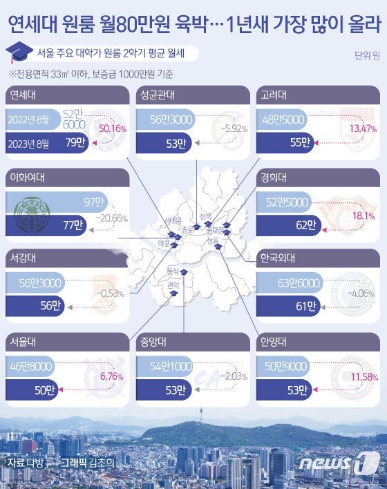 □ [오늘의 그래픽] 연세대 원룸 월80만원 육박...1년새 가장 많이 올라
