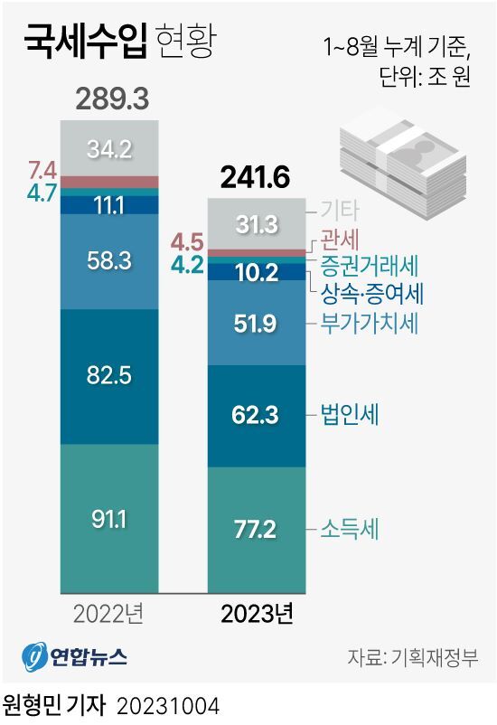 □ 1~8월 세수 작년보다 47.6조 덜 걷혀...진도율 전년比 12.8%p ↓