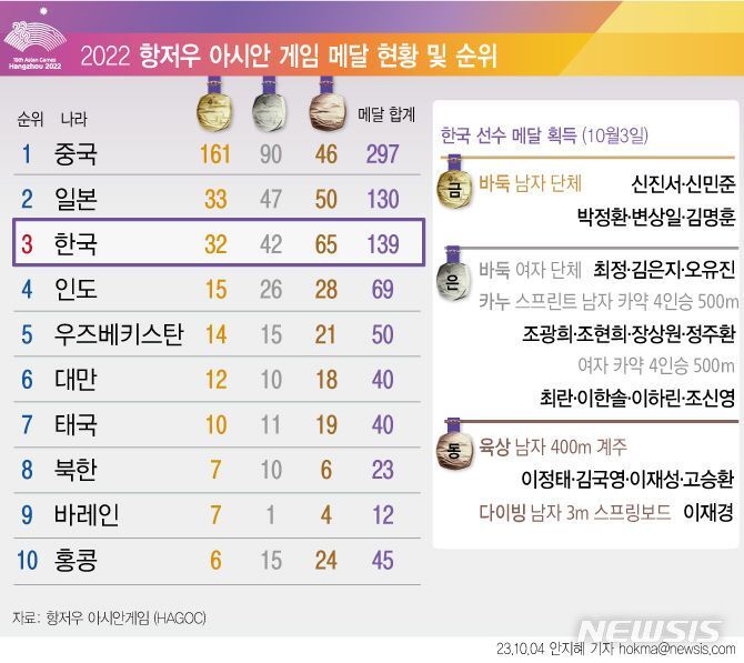 □ 2022 항저우 아시안게임 오늘의 메달 현황(3일)