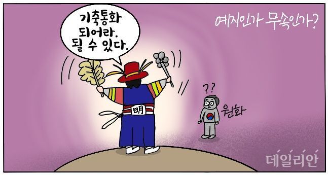 □ 데일리안 [D-시사만평] 예지인가 무속인가…이재명의 아는 척 "기축통화국"