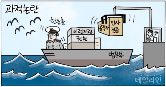 □ 데일리안 [D-시사만평] 한동훈 과적?…어깨에 짊어진 '권한'의 짐